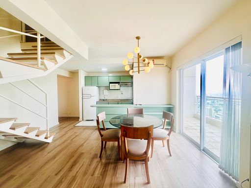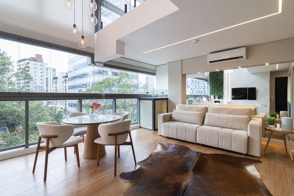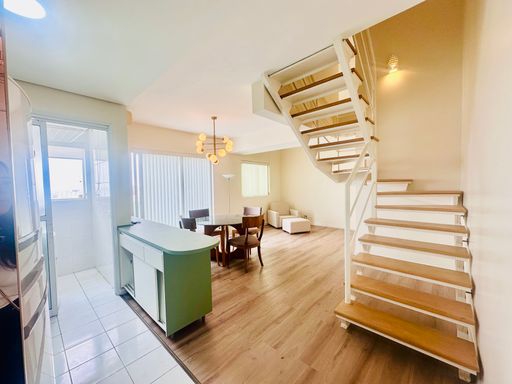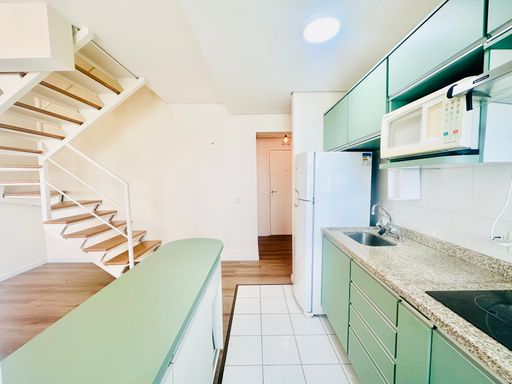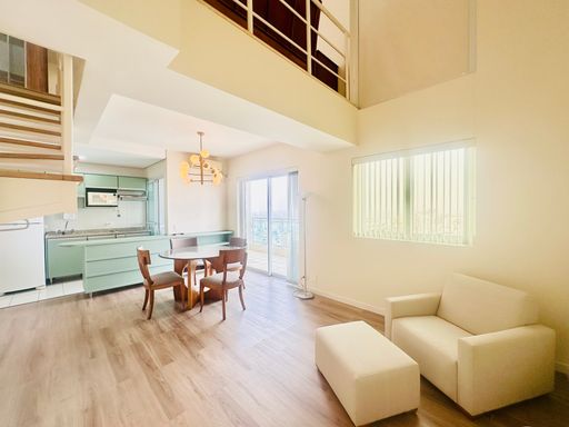 Charmoso duplex mobiliado, com pé-direito duplo e ambientes integrados, oferecendo amplitude e sofisticação.