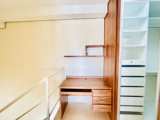 No piso superior, suíte com closet e espaço para escritório, trazendo funcionalidade e privacidade.
