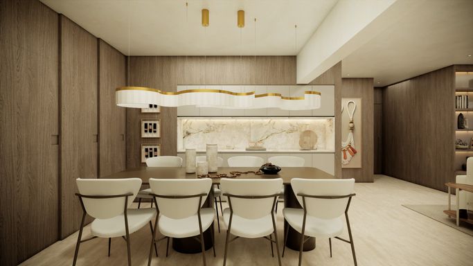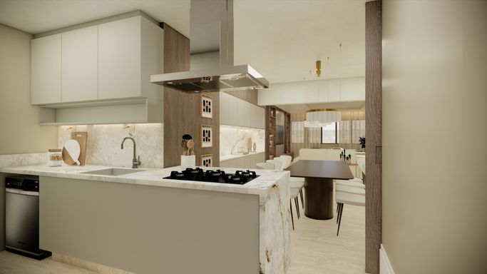 Com 151 m², o living impressiona pela amplitude e excelente luminosidade natural. A área social contempla sala de jantar, sala íntima e lavabo, com possibilidade de cozinha gourmet integrada ou independente, conforme necessidade do morador.