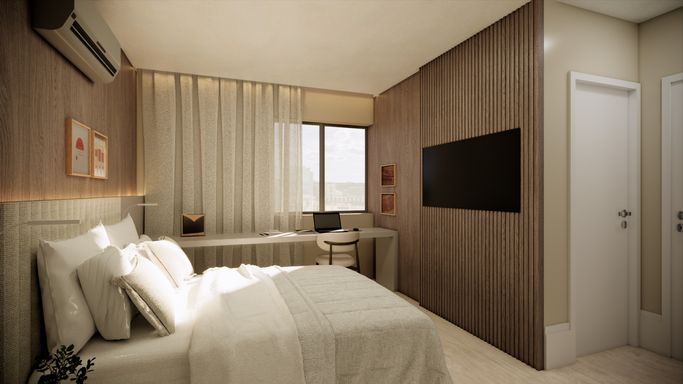 A área íntima conta com 2 suítes amplas, sendo a suíte master com closet generoso, além de janelas antirruído, garantindo conforto acústico em todos os ambientes. O apartamento dispõe ainda de quarto e banheiro de serviço.