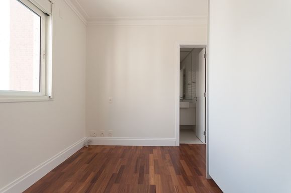 A área íntima dispõe de 3 suítes, todas com piso em madeira, marcenaria completa e ar-condicionado. A suíte master se destaca pelo closet generoso e banheiro Sr. e Sra., com pias individuais, proporcionando conforto e privacidade.