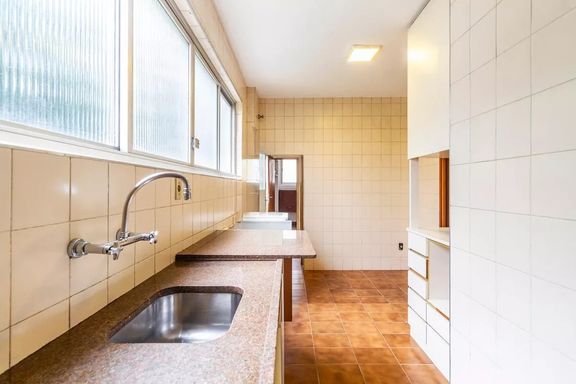 A cozinha, acompanhada de uma charmosa sala de almoço, pode ser integrada à sala de estar, oferecendo praticidade e conforto. O imóvel também conta com dependências completas de serviço. O edifício, muito bem conservado, conta com um belo jardim, área esportiva, salão de jogos e áreas de descanso.