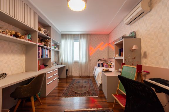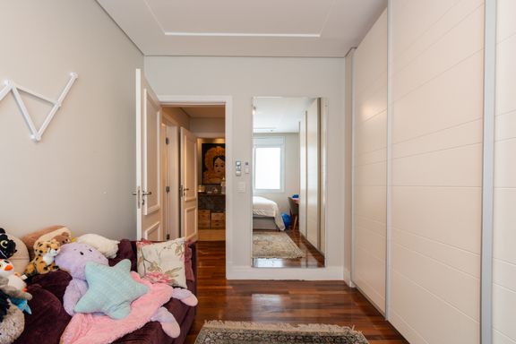 A área íntima dispõe de 3 dormitórios amplos com marcenaria planejada de alta qualidade, sendo 1 suíte master com banheiro espaçoso e banheira. Há também um excelente escritório, ideal para home office.