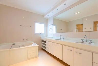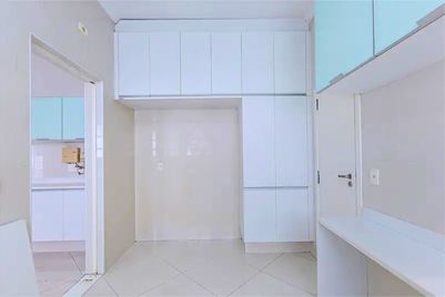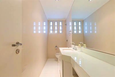 A cozinha e a copa são funcionais e bem dimensionadas, integradas a uma ampla área de serviço, que conta com duas dependências completas para funcionários.