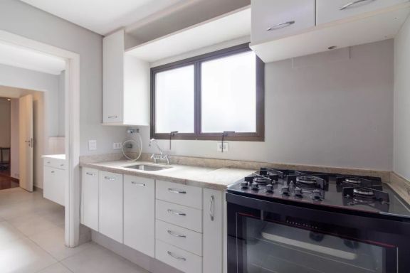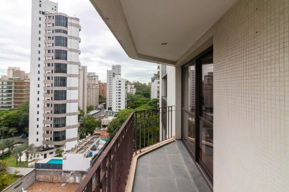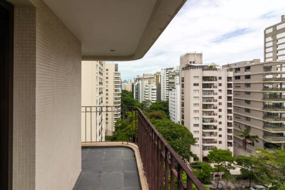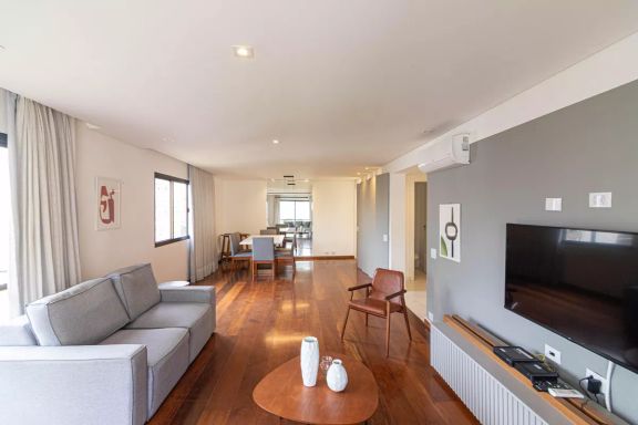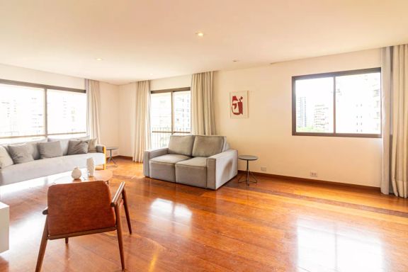 Apartamento amplo e elegante na Vila Nova Conceição, com living generoso para três ambientes, rodeado por varanda e excelente iluminação natural.