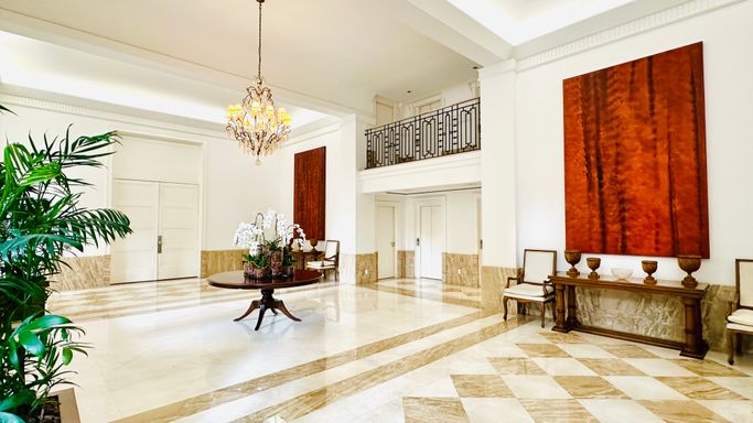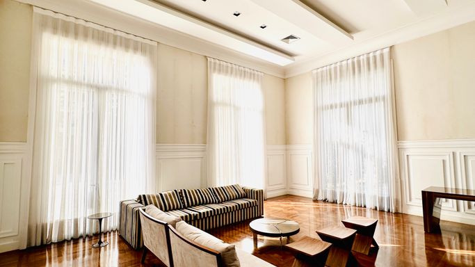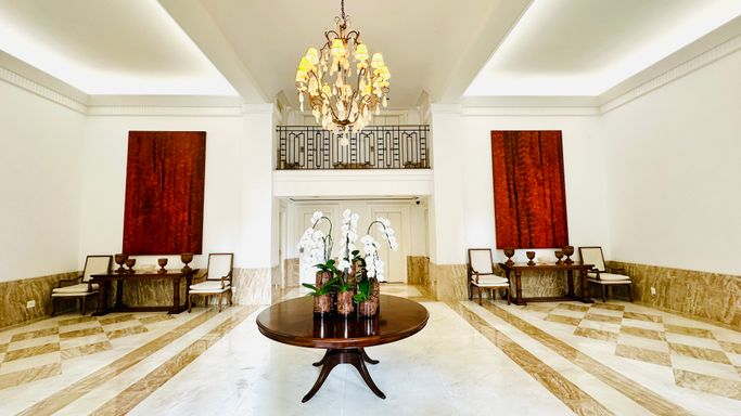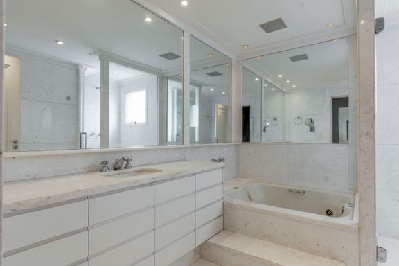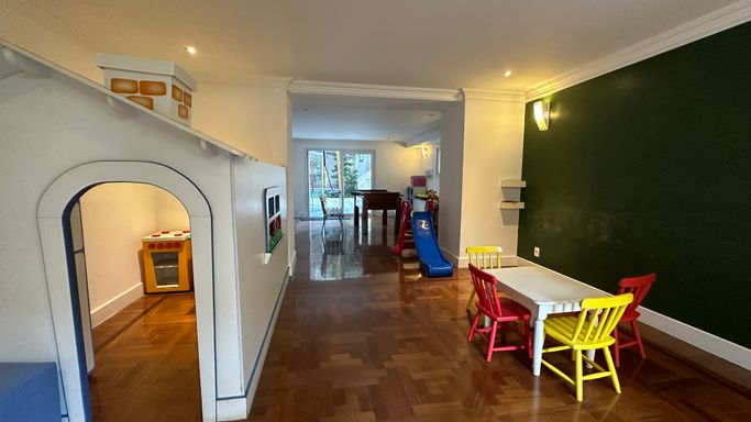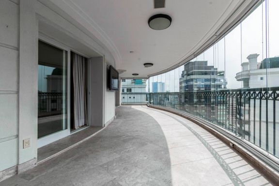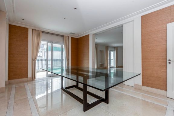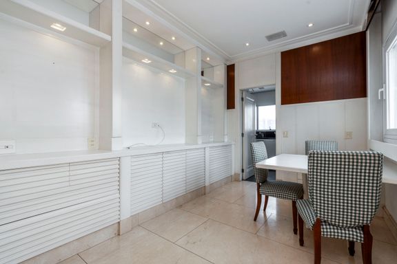 São 440m² , living todo climatizado com varanda espaçosa, ambientes integrados, home theater, prataria, piso em mármore importado e lavabo.