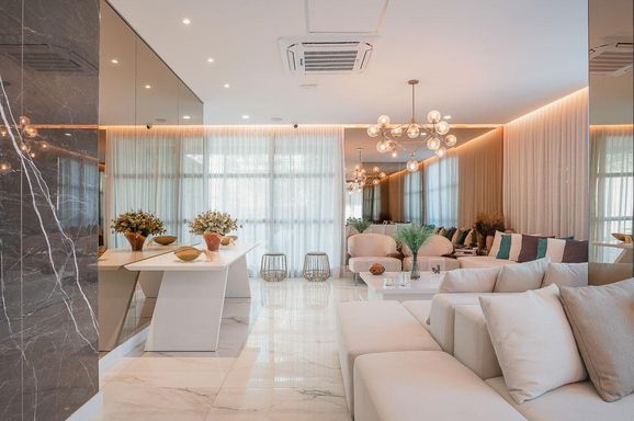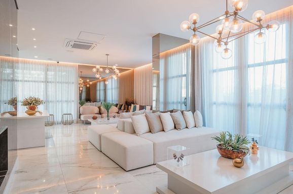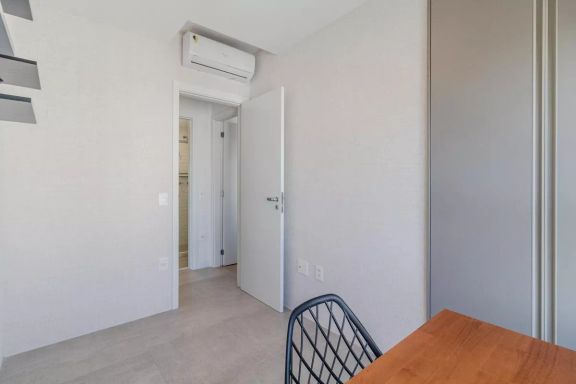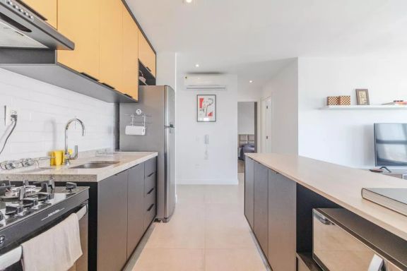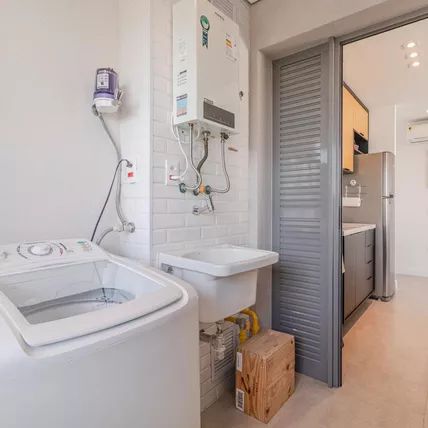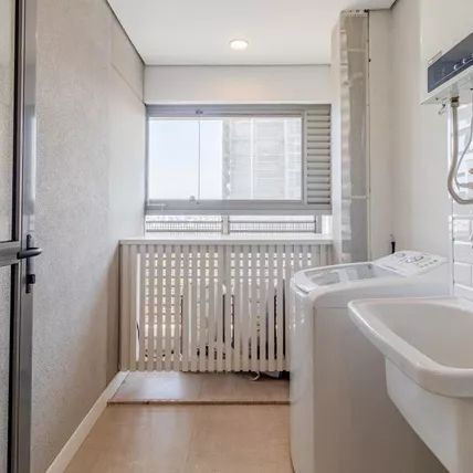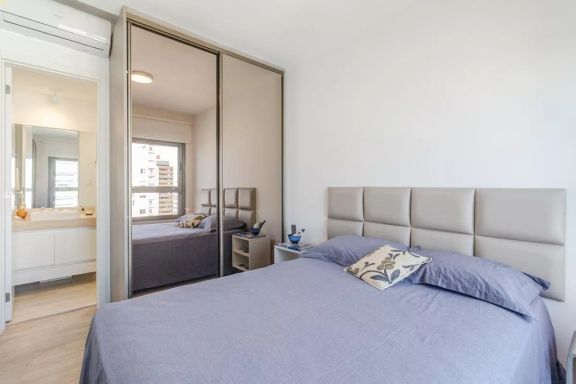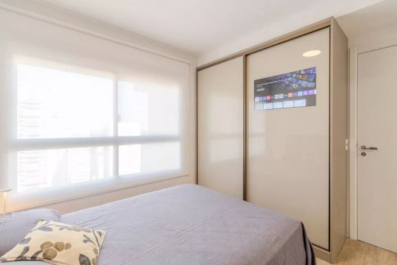 Armários embutidos, cozinha planejada, geladeira, fogão, microondas, máquina de lavar roupa, aquecedor a gás, tv de 50 na sala, tv de 32 embutida no armário da suíte, janelas anti-ruídos com persianas elétricas, todo mobiliado, pronto pra morar.