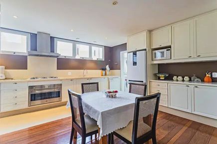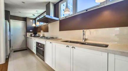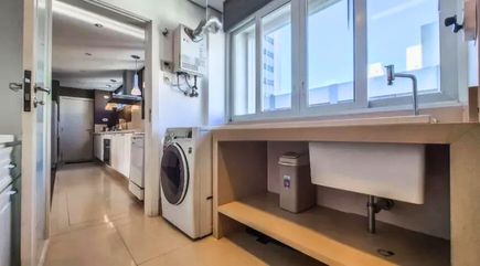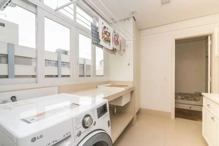 A copa-cozinha é espaçosa e funcional, repleta de armários de qualidade, integrada à sala, ideal para o dia a dia. A área de serviço é bem ventilada e possui dependência completa para funcionário, com dormitório e banheiro.