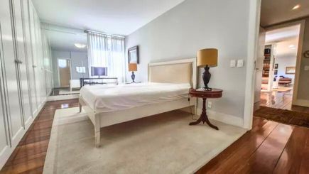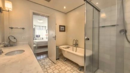 A área íntima conta com 2 dormitórios, sendo 1 suíte, ambos com armários embutidos e ar-condicionado. O banheiro da suíte dispõe de banheira e box separados, reforçando o conforto.