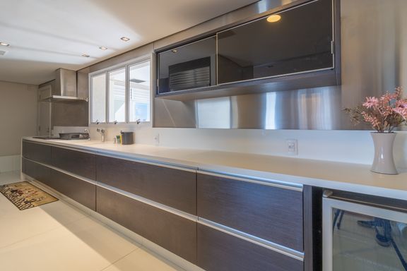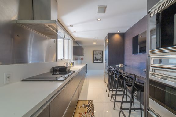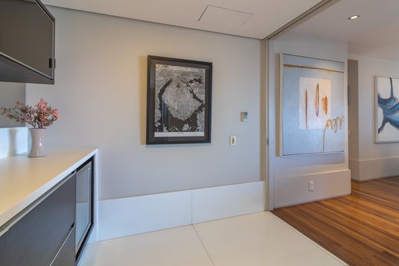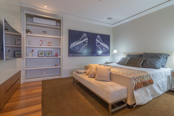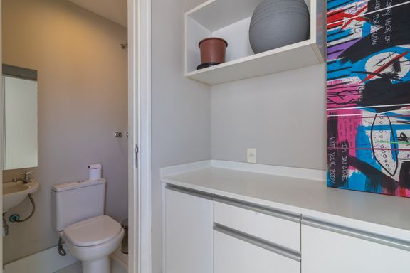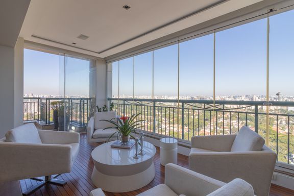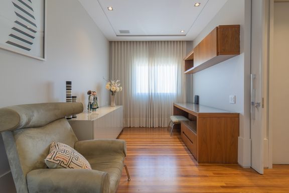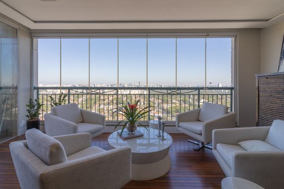 Living para 3 ambientes, claro e amplo, varanda fechada com vidro, 3 suítes, sendo a master com walk closet, lavabo, cozinha com fogão, coifa, geladeira e armários planejados. Nos dormitórios ar-condicionado e armários.