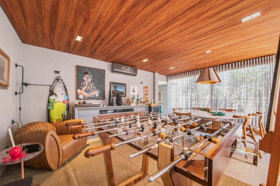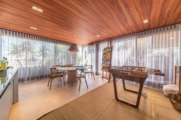 O piso superior conta com uma grande sala integrada ao solarium, terraço descoberto, piscina privativa e área gourmet.