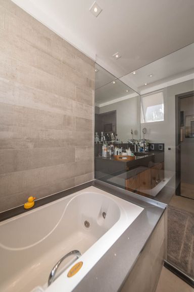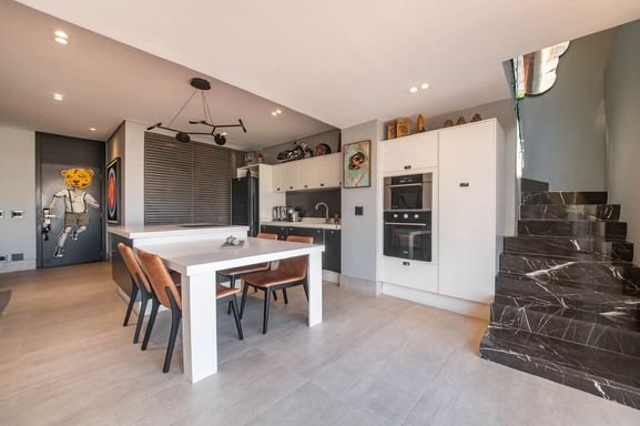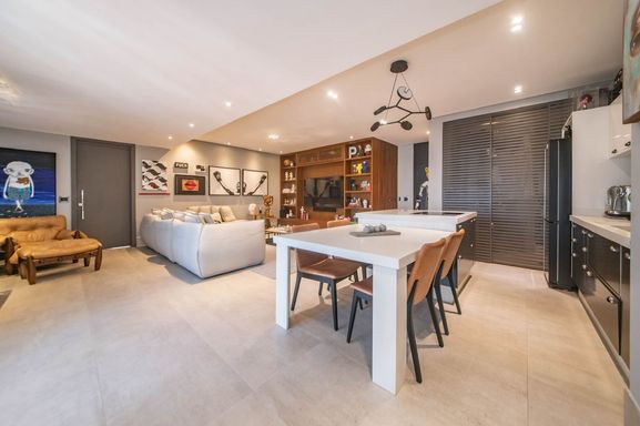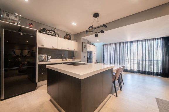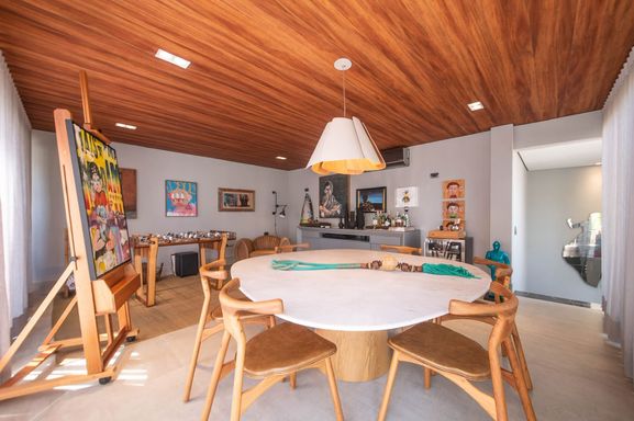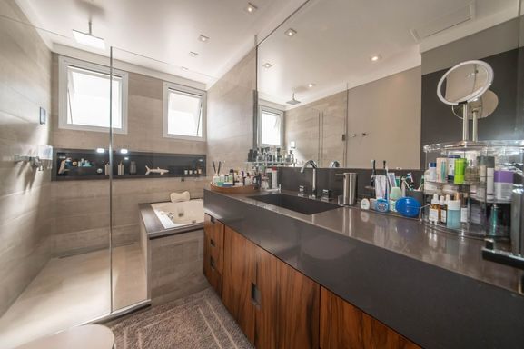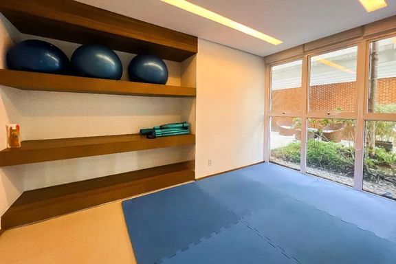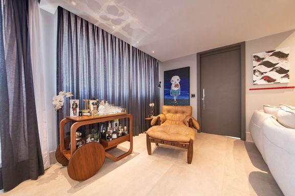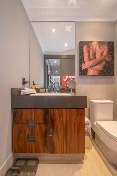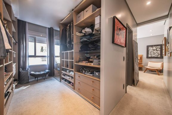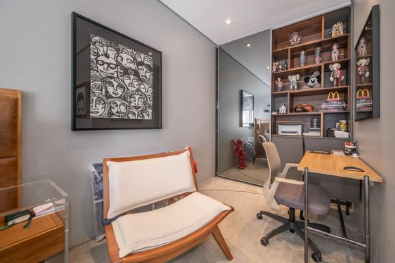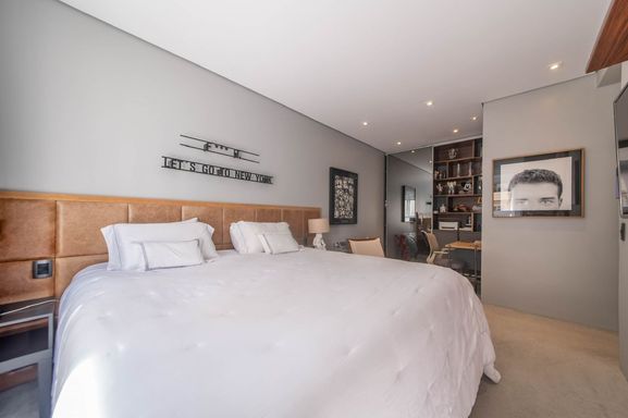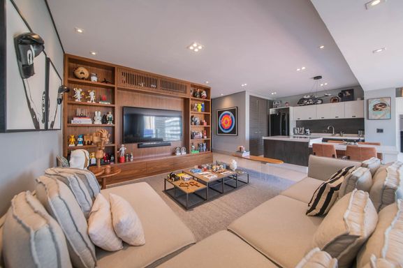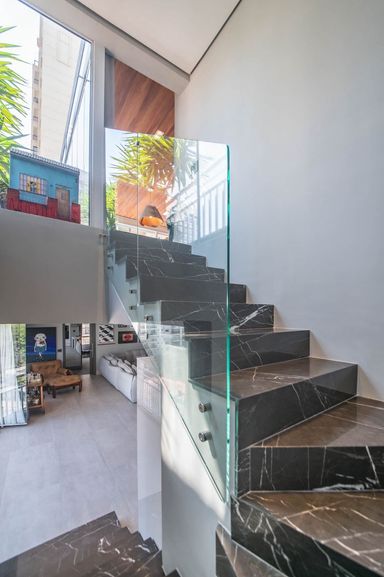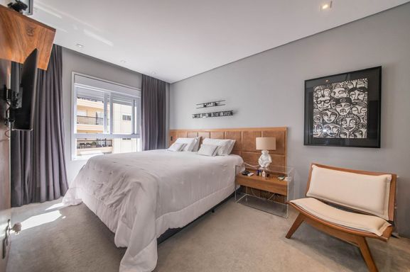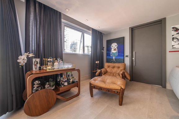 No piso principal, o living para dois ambientes integra-se à cozinha em conceito aberto, criando um espaço moderno e funcional. Há também lavabo social. Na área íntima, o apartamento originalmente possuía duas suítes, sendo atualmente configurado com uma ampla suíte com closet walk-in.