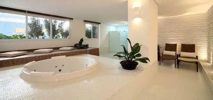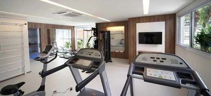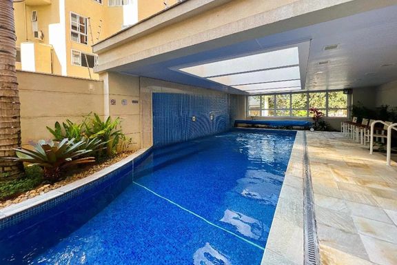 O condomínio oferece excelente infraestrutura de lazer, com piscina descoberta, área de descanso com espreguiçadeiras, spa com sauna e academia equipada.