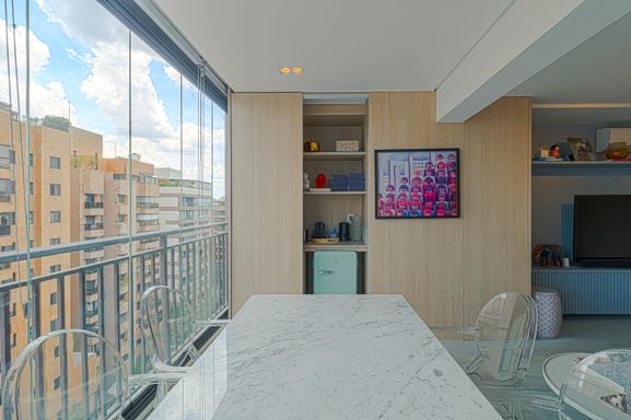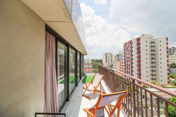 Cobertura duplex nova, já decorada, no Jardim Guedala, com vista aberta e dois terraços que valorizam a iluminação natural e a integração dos ambientes.