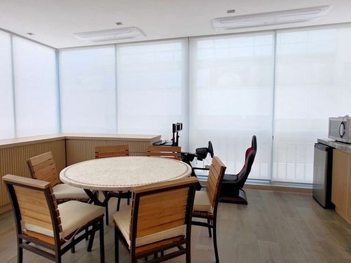 No pavimento superior, o ambiente é dedicado ao lazer e ao conforto e conta com uma espaçosa varanda frontal com piscina e uma vista singular para o Parque Ibirapuera.