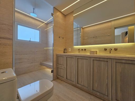 Neste piso ficam três suítes, incluindo a máster com varanda balcão e closet Ornare, além de uma cozinha com copa integrada, lavanderia, despensa e passagem íntima com rouparia.