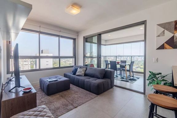 O living para dois ambientes é amplo e bem iluminado, integrado à área social, criando um espaço perfeito para receber. São 2 dormitórios, sendo 1 suíte com closet, todos com armários planejados e acabamentos de alto padrão. A cozinha e os banheiros foram modernizados, e o piso de madeira traz aconchego e sofisticação.