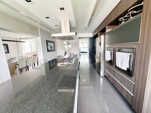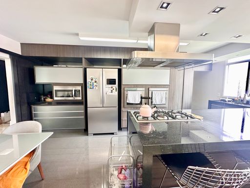 A cozinha é um destaque à parte: equipada com armários planejados, ilha gourmet e acabamentos de alto padrão.
