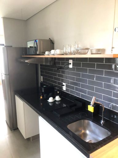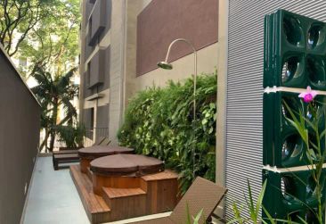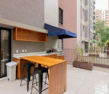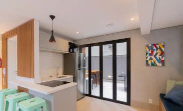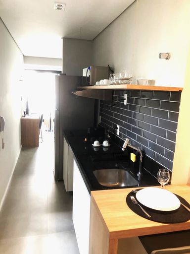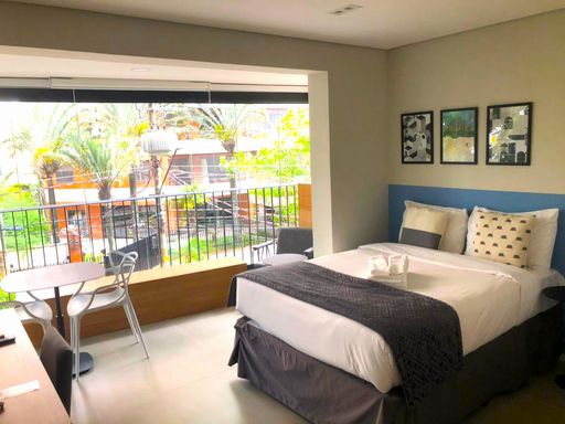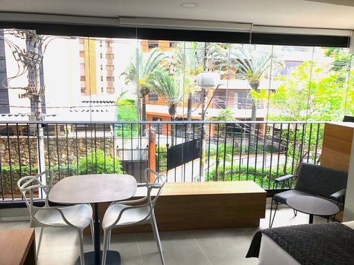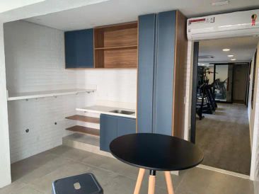Studio porteira fechada. 1 suite, sala, cozinha integrada, varanda fechada integrada à suite. Ar-condicionado em todos os ambientes. Muita privacidade e conforto.