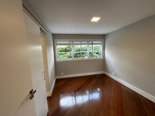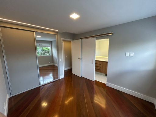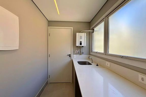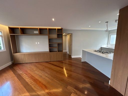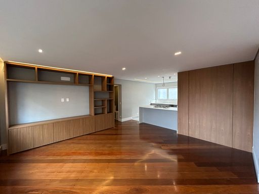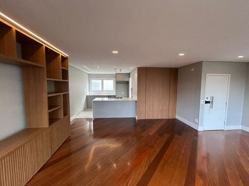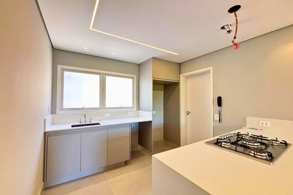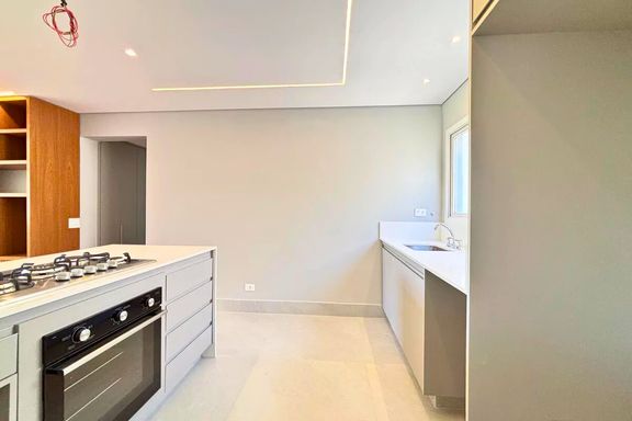 O living integrado, com janelas do chão ao teto, é o grande destaque do imóvel: além da ótima iluminação natural, oferece vista agradável para a copa das árvores, criando uma atmosfera acolhedora e sofisticada. A sala comporta dois ambientes e se conecta harmoniosamente à cozinha planejada, equipada com bancada e ilha, cooktop e forno, além de infraestrutura pronta para todos os eletrodomésticos, inclusive lava-louças.