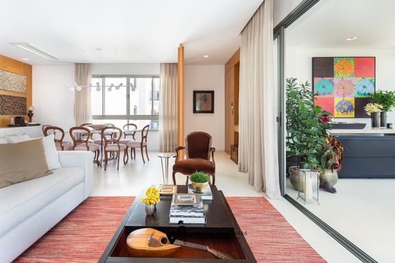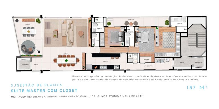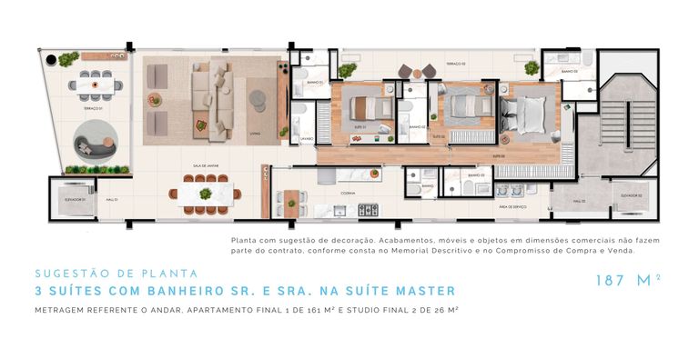 São 187m² muito bem distribuídos, com 3 suítes, 5 banheiros e uma ampla sala de estar que se integra aos ambientes com elegância e conforto.