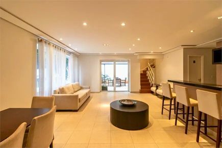 Pé-direito altíssimo na área social, integrando sala de jantar, lounge com bar e sofá em “L”.