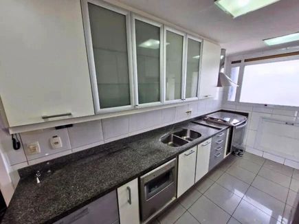 Sala ampla e arejada com espaço para dois ambientes e 1 lavabo. Varanda toda envidraçada com churrasqueira com linda vista da região. Porta de entrada social e de serviço com fechadura eletrônica. Cozinha com armários e conta também com geladeira, micro ondas, fogão embutido, depurador e máquina de lavar louças. Na área de serviço conta com máquina de lavar roupas, um quarto de serviço e 1 banheiro com chuveiro. Com 3 vagas de garagem cobertas.
