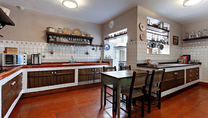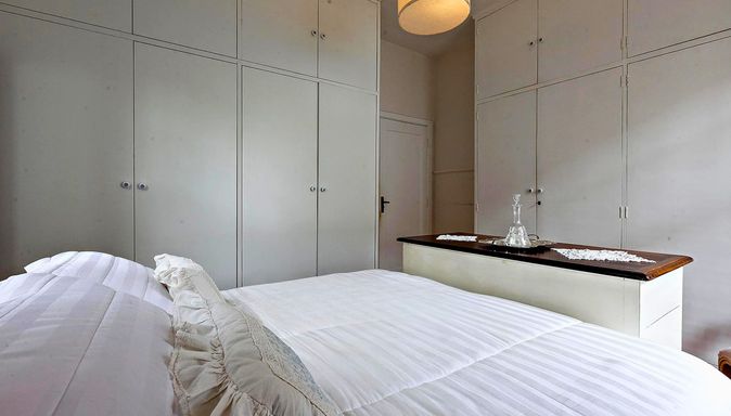No piso superior, há três dormitórios, um com walk-in closet, e dois banheiros completos, sendo possível transformar um dos dormitórios em suíte. A área de serviço inclui lavanderia e dependência de funcionários.