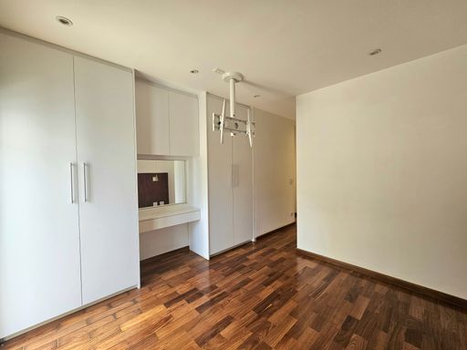 A suíte master é generosa, comporta cama king size, tem muitos armários, closet e acesso à varanda.