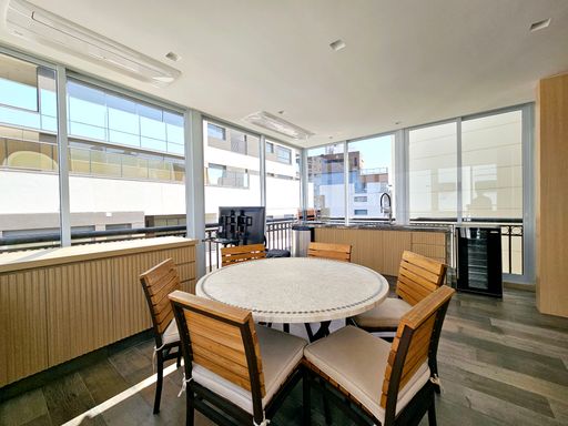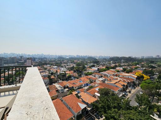 No pavimento superior, o ambiente é dedicado ao lazer e ao conforto e conta com uma espaçosa varanda frontal com piscina e uma vista singular para o Parque Ibirapuera.