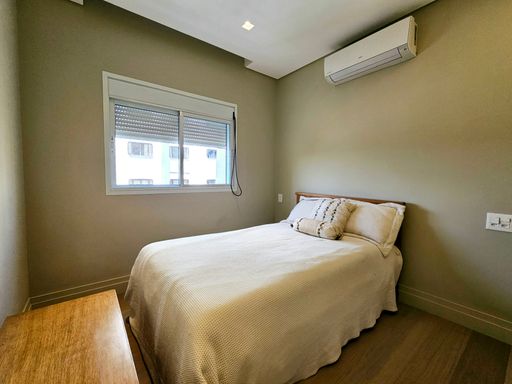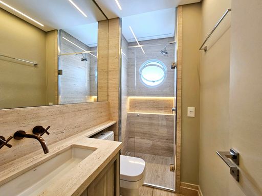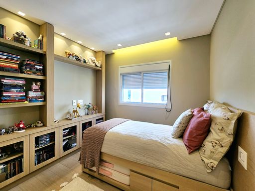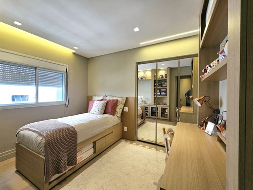 Neste piso ficam três suítes, incluindo a máster com varanda balcão e closet Ornare, além de uma cozinha com copa integrada, lavanderia, despensa e passagem íntima com rouparia.