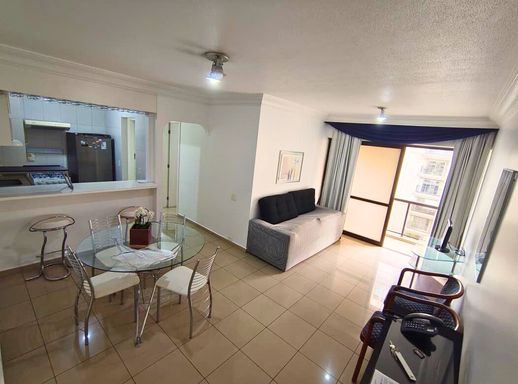 A cozinha planejada e equipada é integrada à sala de estar e jantar, proporcionando um ambiente amplo e confortável. Conta ainda com varanda com vista.