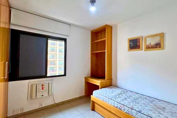 Com dois quartos, sendo uma suíte mais um banheiro extra.